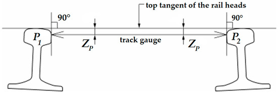Measured in a cross-section, the track gauge is the smallest distance between points P1 and P2, and parallel with the top tangent of the rail heads. The considered ZP distance is below the top tangent of the rail heads (see Figure 1). The value of ZP in the harmonized European Standard (EN 13848-1 [14]) is 14 mm. (In the case of grooved rails, ZP is 9 or 10 mm).