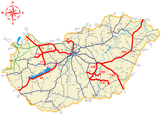 Map of Hungary’s railway network highlighting the ten examined railway lines in red color and adding their ID numbers.