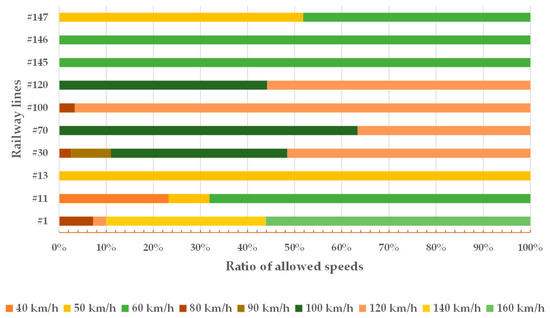 The ratio of allowed speeds related to the examined ten railway lines.