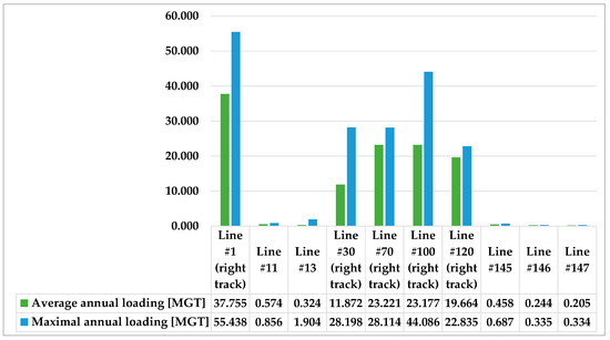 Annual loading values of the examined railway lines between 2013 and 2019.