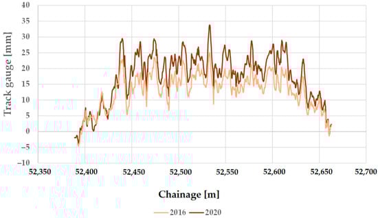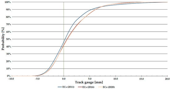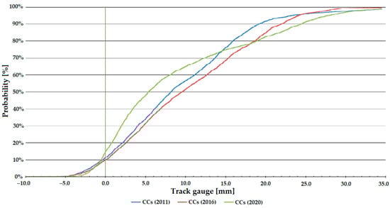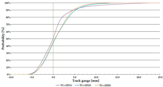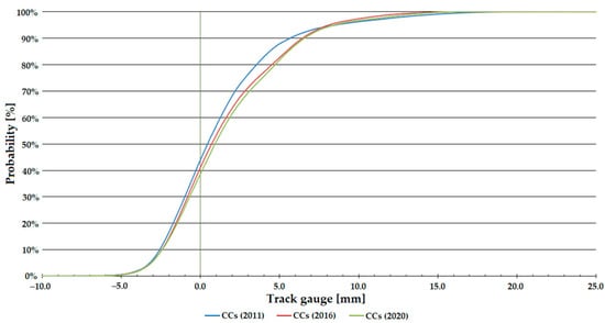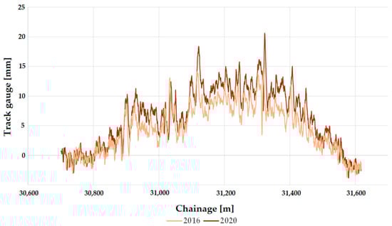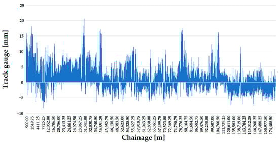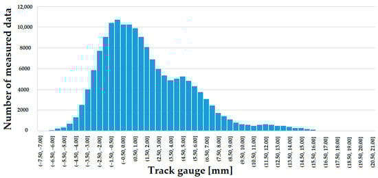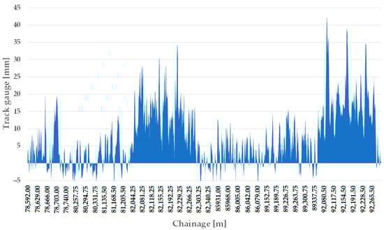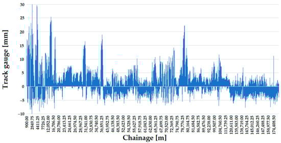 Németh et al. [22] investigated how the track gauge varies with time on five low and five high-traffic Hungarian railway lines, considering only straight track sections. The analyses included calculating the through-rolled axle tons (i.e., the track loading, MGT—million gross tons). The measurement data were provided by the FMK-007 track geometry measuring car owned and operated by MÁV CRTI Ltd. (MÁV Central Rail and Track Inspection Ltd., Budapest, Hungary, where abbreviation MÁV means the Hungarian State Railways, Budapest, Hungary). Track geometry measurements of 25 cm were used in raw form. Mathematical statistical methods were applied to the data analysis including calculating mean, standard deviation, skewness, kurtosis, and Vaszary-type shape numbers of distribution functions. In addition, a spectral analysis of the ten railway lines studied was carried out. It was found that no significant correlation could be detected between the change of the track gauge, average and standard deviation values, elapsed time, and traffic loading (i.e., MGT). For the ten lines studied, it was demonstrated that the distribution functions for the gauge values were neither Gaussian nor lognormal. For lower track speeds, the distribution functions are flatter, while for higher speeds, they are steeper and have a narrower range.
