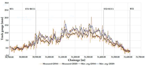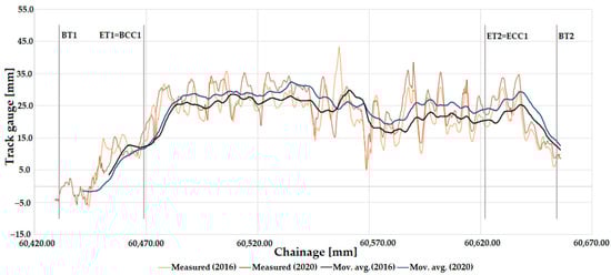 In Section 3.4, selected given curves were analyzed in a detailed manner. Line #1 and Line #11 were selected for this calculation. The track gauge parameter was examined only in the section interval between the beginning points of the transition curves.