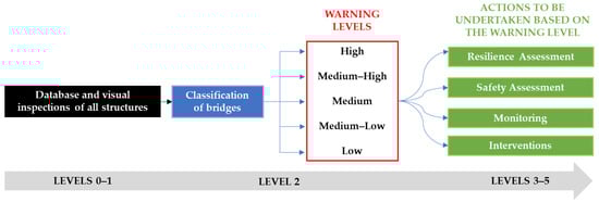 As represented by the figure, the connection between the lower levels (Level 0 and Level 1), applied on a territorial macro-scale, and the more accurate and detailed higher levels (Level 3, Level 4 and Level 5) is Level 2, which is the core of the method and allows the organization of all the following activities, which go beyond the deeper analyses foreseen in Levels 3, 4 and 5, providing the strategies for the full management of the road system. Level 2 provides the classification of all bridges into five warning classes—high, medium-high, medium, medium-low, and low. Specific actions and measures are then identified for each warning class: for bridges with a high warning class, it is appropriate to immediately carry out continuous monitoring activities and accurate safety assessments as foreseen by Level 4; for bridges with a medium-high warning class, performing frequent inspections and preliminary safety evaluations of Level 3 are foreseen; this latter should be also applied for bridges with a medium warning class; finally, for bridges with medium-low and low warning classes, periodical investigations are foreseen. Periodic inspections and maintenance interventions, properly planned and performed, are recommended in any case, but their frequency and extent are calibrated based on the warning class resulting from the classification. Furthermore, these activities allow us to update the warning class over time.