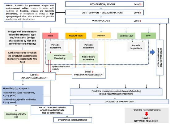 From Level 0 to Level 5, the complexity, the detail level and the onerousness of investigations and analyses increase, but the number of bridges subjected to analysis and the involved uncertainties are reduced. All the levels are connected, according to the logic flow in Figure 2.