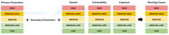 The bases of the classification method are the results obtained from the activities of Levels 0 and 1, which shall be applied to all the structures, and the approach for the definition of the warning classes reflects the typical framework of the risk definition: it is based on the combination of hazard, vulnerability and exposure factors, which are defined differently for each different kind of assessed risk. These factors are defined by the combination of primary and secondary parameters, which are relevant for the definition of each specific risk, with the former considered to be more relevant than the latter, see Figure 3. In this way, not only the state of preservation is considered, but also other parameters, e.g., the ageing of the structure, the material of the structural elements, the static scheme, the design traffic loads, etc.