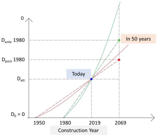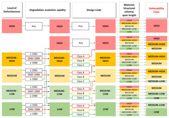 After the evaluation of the LD, it is firstly corrected with the parameter related to the degradation evolution rapidity. It is determined considering the building period of the bridge, known or supposed, which can be before 1945, between 1945–1980, and after 1980. The class resulting from matching the LD with the building period is defined by presuming that, for the same LD, more recently built bridges are more worrying than less recently built ones because it means that the evolution of the degradation was faster. This assumption is schematically described in Figure 6. This procedure, which is reasonable for recent structures with poor conservation status, risks penalizing the new ones with good conservation status, instead. In this regard, the Operating Instructions provide that the recently built structures designed with standards in force from 2005, with low or medium-low LD and with some technical documentation at disposal (the original design, the report on the complete structure with the relevant checks, the static acceptance certificate and, if necessary, the technical–administrative acceptance certificate) can be directly associated to a low vulnerability class.