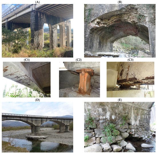 Defects on bridges that may imply a high level of defectiveness. (A) Prestressed RC simply supported deck on RC frames: detachment of concrete cover from pillars along the whole height, with reduction of the cross section; corrosion of the rebars; Reduction of the support area of the beams due to detachment of concrete cover, both in beams and pillars. (B) Masonry arch: Rotation of the right abutment of the bridge, inducing compression on the arch, and resulting on extreme damage in its central part. (C) RC simply supported decks on RC pillars: (C1) Reduced concrete cover, with exposure of rebars; (C2) Corrosion of rebars, with reduction of section of the longitudinal ones and breaking of the transversal ones; (C3) Complete oxidation and blocking of the supporting devices. (D) Masonry arches: erosion of the basement of the pillar. (E) Masonry arches with abutments made of irregular stone: erosion of the base of the abutment.