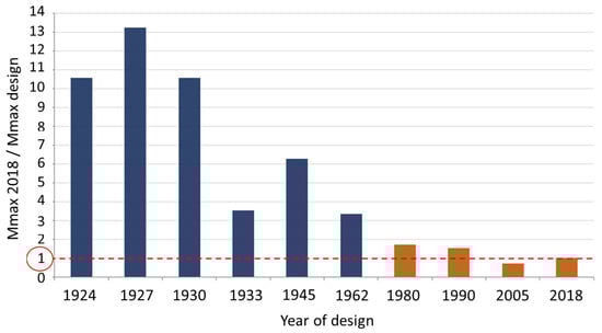 After the degradation evolution rapidity, the design standards are considered. They are classified into three classes, considering the changes in standards over time and, in particular, of the traffic loads. Indeed, if the Italian standards in force over the years are analyzed starting from the first one—i.e., Normale n. 8 issued in 1933—the values and the schemes of the design traffic loads have been modified, following also the change of vehicles passing on the roads, with an increasing caution in the definition of values and safety factors. The ratio between the maximum bending moment due to the traffic loads currently provided by the Italian technical standards [24] and the maximum bending moment due to the traffic loads foreseen by the standards in force over the years evaluated for a simply supported beam is shown in Figure 7. This figure shows one of the outcomes of a parametric study [25], where the values of the bending moment due to the traffic load defined accordingly to various standards and acting on an isostatic system (a simply supported beam) are compared to the value of the effect due to the traffic load calculated by adopting the currently in force Italian Standards [24]. In this study, four span lengths (from 5, 10, 15, 20 m) structures with 9 m wide decks (meaning a driveway width of 7 m and two one-meter-large sideways) are investigated; these parameters are selected based on the most recurrent and representative configurations for the Italian existent reinforced concrete bridges. The figure, in particular, represents the ratios obtained for the 5 m-long ones. The ratio is close to 1 only for the standards in force from 1980 until now, whereas it is higher than 1 for the less recent standards. It means that, at least before 1980, the new bridges were designed with traffic loads lower than those foreseen now; therefore, bridges built less recently have a lower safety level with respect to the actual traffic loads. Similar considerations can be performed for the other bridge configurations investigated.