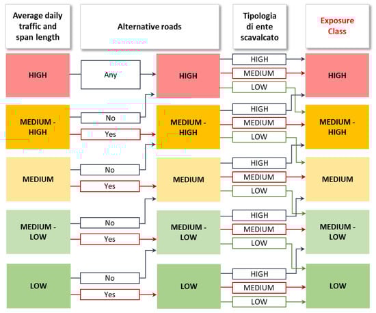 The last factor for the definition of the structural and foundational class is exposure, which is related to the other elements besides the bridge that are exposed to the risk of being damaged in case of structural failure or damage of the bridge. The logic flow to the definition of the exposure class is shown in Figure 8.
