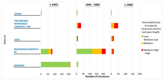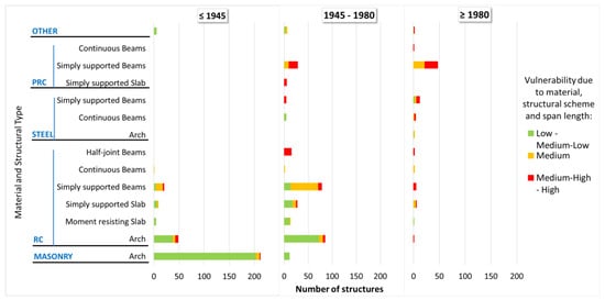 The “uniform” sample is composed of 225 items (corresponding to all the possible combinations for the vulnerability class), distributed uniformly among the three construction periods (33% for each one). For each construction period, they still are distributed uniformly among the MSS classification (for each construction period, 20% for each MSS class). The “real” sample is composed of 661 structures, among which 45% were built before 1945, 42% between 1945 and 1980, and 13% after 1980. For each construction period, the MSS class is not uniformly distributed due to the different use in years of material and structural schemes thanks to the development of new structural and constructive technologies. This is confirmed by the analysis of the distribution of the structures in terms of deck material and structural scheme in the three construction periods. Figure 9 represents the “real” sample, distinguishing for each construction period the number of structures for the different deck materials. For each group of deck material, the amount of structures characterized by different levels of vulnerability due to material, structural scheme and span length (step 4 to the evaluation of vulnerability class, Figure 4) are highlighted. Figure 10 is a detailed version of Figure 9, since for each deck material, the structures are grouped in the different structural types. In Figure 9, it can be noticed that most of the structures of the sample were realized before 1980, and only 13% were indeed built after 1980. Despite this, masonry bridges were widely used before 1945, while afterward (1945–1980) concrete technology became relevant. After 1980, with the spreading of new construction techniques (e.g., prestresses RC decks), simple RC structures became less adopted.