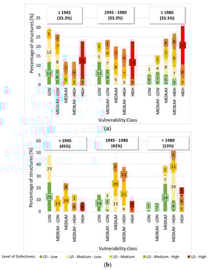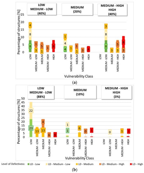 Second output: (a) Uniform sample and (b) “real” sample. For the ≥1980 construction period and for each class for the MSS, percentage of structures characterized by low to high vulnerability classes. Level of defectiveness is highlighted.