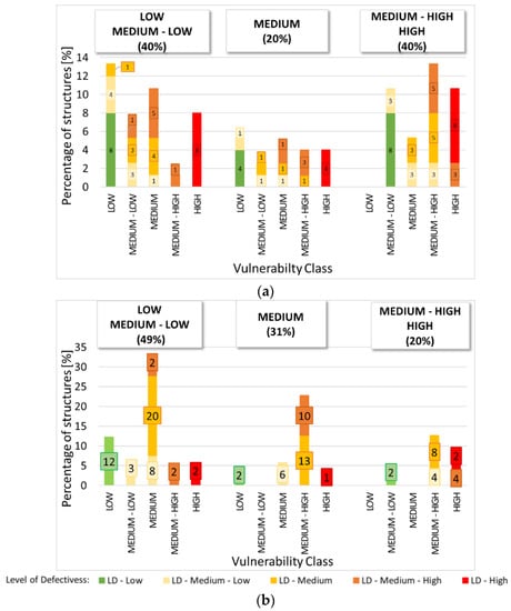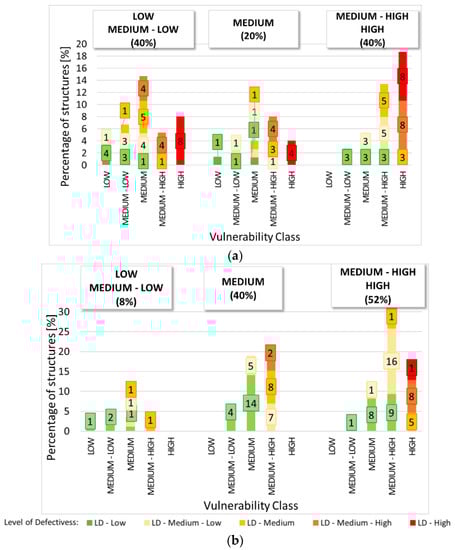 Second output: (a) Uniform sample and (b) “real” sample. For the ≤1945 construction period and for each class for the MSS, the percentage of structures characterized by low to high vulnerability classes. The level of defectiveness is highlighted.
