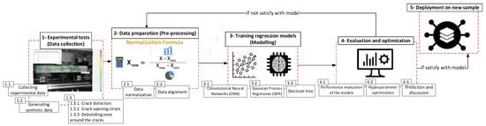 In a previous study by the authors [], strain gauges were installed in only a few locations through the embedded reinforcement. Therefore, there were not enough available data to meticulously train the ML regression model. Thus, the use of hybrid learning was proposed in this study to feed the model with both experimental data and synthetic data generated by a previously published semi-empirical equation []. To this end, data collected from installed strain gauges usually located between the appearing cracks with no bond–slip were combined with additional synthetic data for the crack zones and around the debonding/slip zones. The theory behind this equation was based on the tension stiffening effect, which can simulate the debonding and bond–slip zone around the cracks. Then, machine learning (ML) regression models were generated and trained, approaching a hybrid learning method. The developed models were evaluated through numerous statistical performance measures to find the most efficient trained model. Finally, if we were satisfied with the performance of the trained model, it was deployed on a new sample with no previously observed data. Otherwise, the input dataset needed to be checked and prepared for training by the new optimized regression models. Figure 1 shows the proposed workflow, which will be defined in detail in this paper.