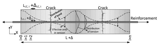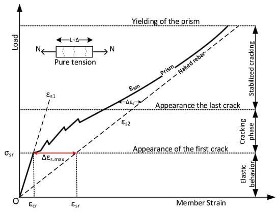 where is the crack opening strain, while a concrete crack is initiated if the strain exceeds 0.010% to 0.012% []. The axial stiffness of the RC member proceeds toward the naked rebar via crack propagation, developing debonding zones and decreasing concrete collaboration in transferring tensile stress, as shown in Figure 2. Therefore, this behavior, called the tension stiffening effect, can be defined as a non-linear model. As illustrated in Figure 3, the contribution of concrete to tension is a non-linear function of the concrete’s strength, geometry, reinforcement ratio, bond properties of the reinforcement, and the modular ratio [].