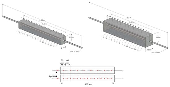 Initially, the rebars were cut to a length of 1500 mm. The tension concrete prism had an 800 mm long reinforcement in the middle of the cross-section while the bars extended outside the concrete prism by 350 mm on each side, as shown in Figure 4. Eight prepared specimens were equipped with eight embedded SGs and two other specimens were equipped with 15 SGs. In the rebars with eight SGs, the first one was located at approximately 50 mm from the edge of the concrete and the distance between the gauges was approximately 100 mm. In the rebars with 15 SGs, the distance between them was approximately 50 mm, as shown in Figure 4. All attached strain gauges were connected to a computer in the laboratory and recorded at a rate of 10 Hz by a data acquisition system.