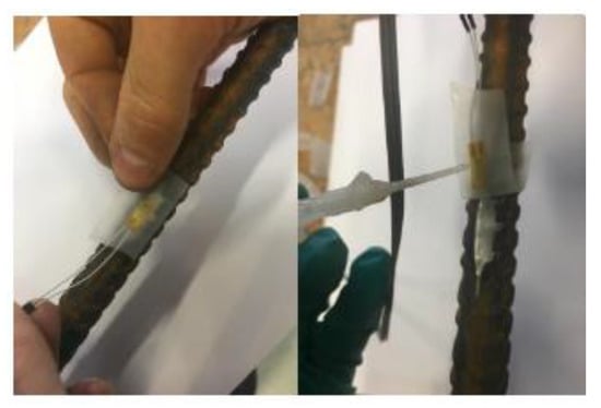 To install the SGs, a belt grinder was used to grind the areas where the SGs were located, and sandpaper was used to further smooth the surface. The strain gauge was removed from the protective plastic and normal tape was applied to the top of the strain gauge. The tape was used to apply the gauge straight along the rebar and lift one side of the SG. Then, adhesive (Rapid Adhesive Z70 by HBM) was applied to the strain gauge and connecting cables, as shown in Figure 5.