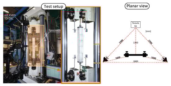 The prepared specimens were tested under pure tension using a 600 kN testing machine, where the reinforcement on both sides of the specimen was secured. Specimens were aligned in the machine; thus, the surface of the specimen was perpendicularly aligned to the DIC system. To enable the software to measure the total displacement of the machine, the component “Stroke” was created defining the distance between the plates attached to the bottom and top grip of the machine, as shown in Figure 7. On the plates of the testing machine connected to the fixed reinforcement, two components were created, “ReinfTop” and “ReinfBot”, and the component “AvgBarStrain” was defined to visualize the rebar average strain in the DIC system, as shown in Figure 7.