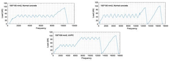 Load sequences for: (1) 100 × 100 mm2—Normal concrete, (2) 150 × 150 mm2—Normal concrete, and (3) 100 × 100 mm2—HPC.