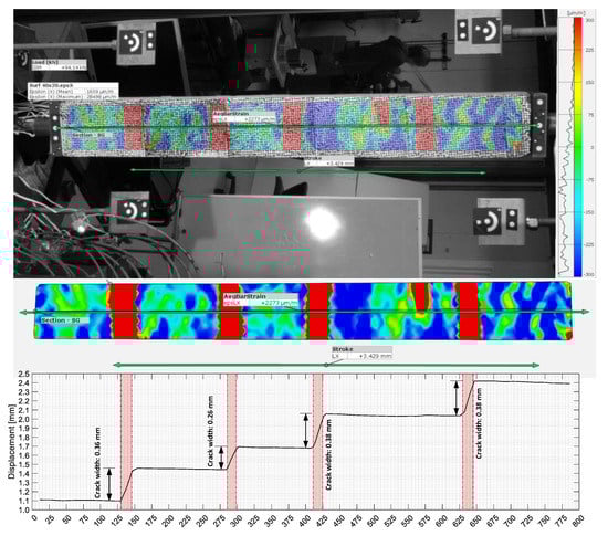 Concrete cracking is usually an indicator of RC structure performance; therefore, crack mapping and assessment in RC members is an important step in concrete infrastructure inspection. In addition to cracks, reinforcement strain, which is usually accompanied by bond–slip and concrete cracking, has particular importance in evaluating a structure’s status and safety. Observed strains that are close to the yielding strain of the reinforcement indicate structure overloading or that a failure is about to occur.