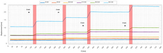 Appearing cracks can be detected as a jump in the surface displacement []. Figure 10 presents the location of four propagating cracks on 2N100, in order of propagation, under six different loading levels. Accordingly, Table 4 summarizes the loading levels reached by the testing machine at the time that cracks formed for all specimens. As can be seen, due to the higher friability of HPC samples compared to NC samples, more cracks appeared at higher loading levels.