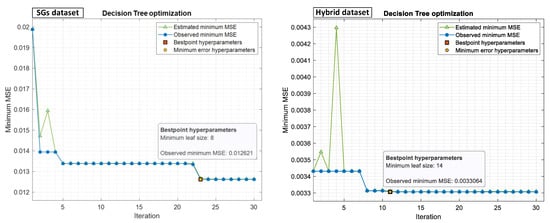 Minimum MSE plots for decision tree method in both experimental and hybrid datasets, which were updated by Bayesian optimization runs.