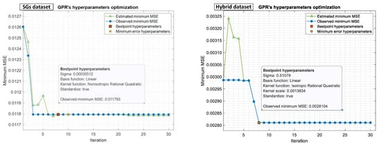 Gaussian Process Regression (GPR) is a nonparametric Bayesian approach for regression analysis that creates a significant impression in machine learning. There are several benefits to GPR, including working well on small datasets and providing uncertainty measurements on predictions. Existing hyperparameters need to be optimized, including basis function, kernel function, and scale, together with the noise standard deviation used by the algorithm, called sigma. Hyperparameter optimization was performed in 30 iterations or less, searching ranges using the Bayesian optimization method for both the SG and hybrid datasets, as shown in Figure 14.