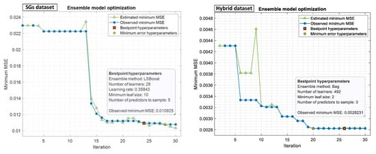 Ensemble model is a technique that combines multiple models and then finds the best combination to produce improved results. For this aim, bootstrap aggregation (bagging) [] and least-squares boosting [] models were used to train the regression models. Then, Bayesian optimization was used to test the different combinations of hyperparameters for both the SG and hybrid datasets to find the optimized hyperparameters in the range of 10–500 learners, with a learning rate in the range of 0.001–1 and a minimum leaf size in the range of 1 to , as shown in Figure 15.