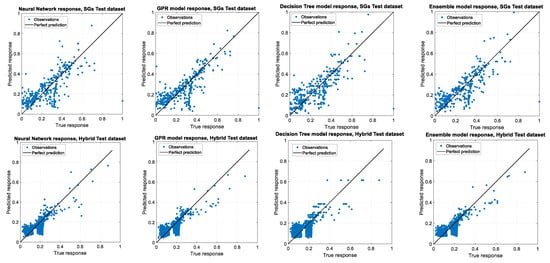 The predictions by the four optimized models compared with true values in both the experimental (SG) and hybrid datasets, according to statistical parameters. Figure 16 shows the graphs comparing the true and predicted responses by the four optimized regression models, and Table 6 presents the summary of the validation and accuracy tests to find the most efficient models trained by each experimental and hybrid training dataset.