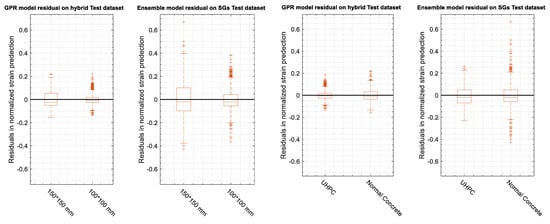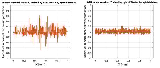 As presented in Table 6, the ensemble model and GPR showed better performance on the training datasets generated experimentally (SG) and by the hybrid learning approach, respectively. To compare the performance of these two ML regression approaches, the residuals in normalized strain predictions are illustrated in Figure 17. Residuals represent the difference between any data point and the regression line, which can be called “errors,” and are expressed as the difference between the predicted and observed values.