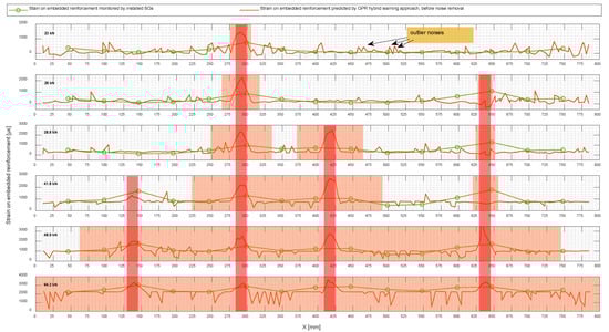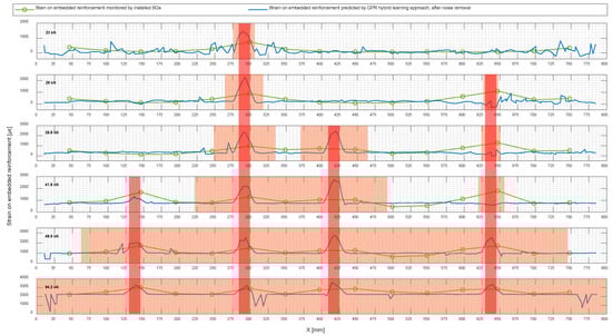 Figure 20 shows the noise-removed prediction of strain in embedded reinforcement using the hybrid learning approach alongside that obtained by monitoring the installed SGs.