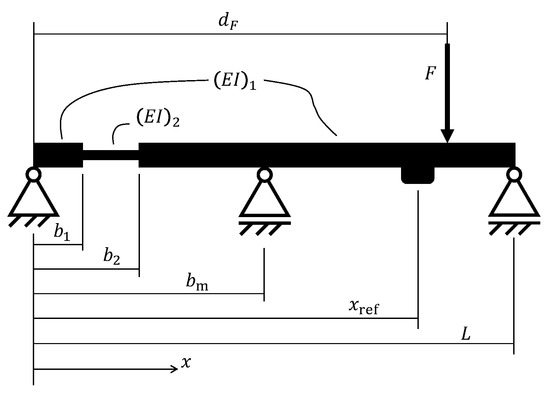 In the analytical investigation in Section 2.1 and Section 2.2, we use the stepped Euler–Bernoulli beam. We modelled the stepped Euler–Bernoulli beam according to [] based on the Euler–Bernoulli theory. Our resulting Matlab implementation of the stepped Euler–Bernoulli beam can be found in []. In this work, we always consider a two-span beam as shown in Figure 1 which has the length L. A continuous beam is statically indeterminate, and its behaviour is closer to that of real structures than a single-span beam. In this work, the middle support is always in the middle of the beam ().