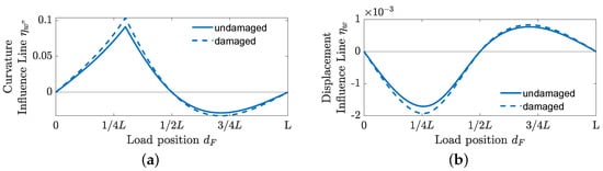 Example influence lines with reference point for the undamaged and damaged bending beam. Change in bending stiffness is at % between and . (a) Curvature influence line at . (b) Displacement influence line at .
