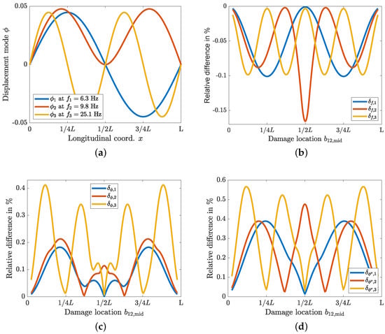 First, we consider the changes in the modal parameters. Figure 3 summarises the results for the modal parameters. The first three modes (, and ) are shown in Figure 3a for the undamaged case. Here, the amplitude is plotted along the longitudinal beam direction x. The modes are mass normalised. In Figure 3b–d, the relative difference is plotted as a function of the damage location . The relative difference of the hth natural frequency is calculated with