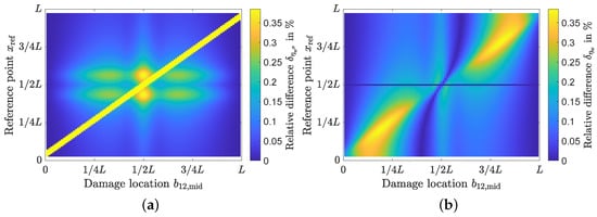 The largest relative difference of the displacement influence line in Figure 4b is in a curved diagonal. The band of the diagonal is wider than for the curvature influence line, and it is sufficient if the reference point is close to the damage location . On the diagonal, the relative difference is between 0.1229% and 0.3838%. Between the diagonal with the high relative difference and the middle support runs a second diagonal that shows a very low relative difference .
