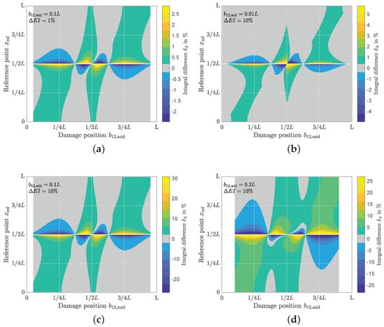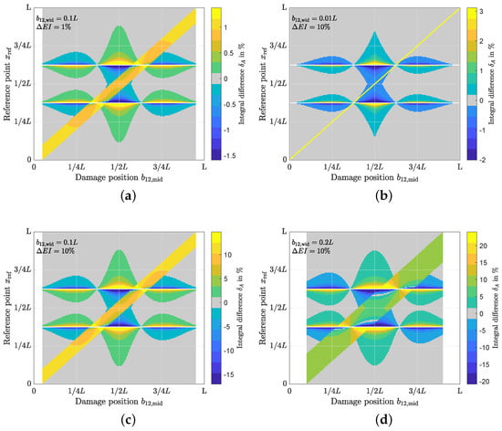 from the integral of the damaged beam and the integral of the undamaged beam . The damage position is plotted on the abscissa and the reference point is plotted on the ordinate. The integral difference is shown in colour. The minimum and maximum on the colour scale for the integral difference have been truncated to allow evaluation. This is because the integral difference for the curvature influence line goes to infinity in and in . The integral difference of the displacement influence line goes to infinity in . For better orientation, the area in the contour images with a change close to 0% is shown in grey. The grey areas thus indicate combinations of damage location and sensor position , which are difficult to detect because the integral difference in this area is near zero. As the damage width increases, the damage middle begins and ends shifted. This unaccounted region is white at the left and right edges (compare Figure 5b for smallest damage width with Figure 5d for largest damage width).