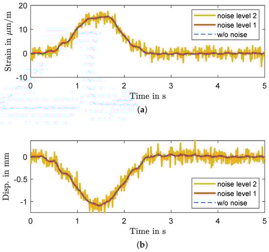 We conclude from the results in Table 3 and Table 4 that with both quantities (strain in the x direction as well as displacement in z direction) a damage detection is possible, with strain in the x direction performing better than displacement in the z direction for a similar SNR. The worst feature for both quantities is the natural frequencies f from the decay of the bridge after the vehicle has left the bridge. Surprisingly, the natural frequency is already not robust against noise at Noise Level 1.