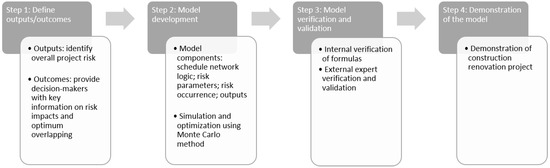 35]. Two construction project managers with more than 20 years of experience, one from the interview group and another not associated with the interview group, evaluated the model outputs. Both validators agreed that the model answered the research questions. One of the reviewers did comment that the model would be limited for using it in practice because they do not perform these risk analyses. The results below, modified from [