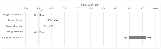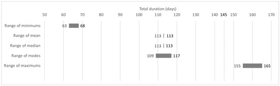 A summary of the statistics results for the total duration and total cost, expressed as ranges, is presented in