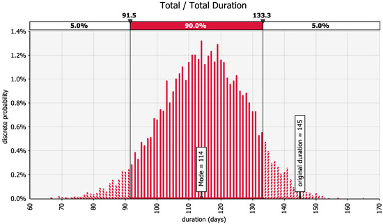 Figure 5. The curve represents the output of only one simulation run. The lower horizontal axis indicates the potential project duration, and the upper horizontal axis indicates the cumulative probability for specific duration intervals. The vertical axis indicates the discrete probability for the potential project durations. Some durations obtained may reflect the occurrence of no risks, but the likelihood of having a total duration inferior to 92 days is only 5%. The curve shows more than a 90% chance of finishing the project up to 133 days and a minimal chance of 0.3% of finishing late after the original duration of 145 days. The chart also shows that 114 days was the project’s most frequent potential total duration. By complementing these results with the results shown in