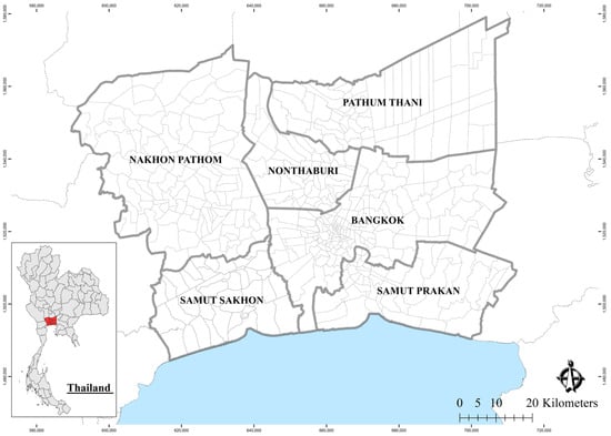 Notably, over 90 percent of the world’s fatalities in road traffic accidents occurred in low- and middle-income countries (the most recent (2022) categories range from USD 1045 or less for low-income countries to an upper range of USD 4096–USD 12,695 for upper-middle-income countries) [7,38]. Thailand is one of the middle-income countries that have serious road traffic accidents. Each day Thailand behaves in ways that increase the risk of a road accident [39,40]. For example, more than 80 percent are accidents among motorcycle users. Concerning road traffic fatalities data (2017–2021) for all travel modes, data showed 96,230 deaths (an average of 15,000–19,000 deaths per year). For pedestrian accidents, road traffic fatalities data showed an average of 513 deaths per year [40,41]. This study selects the BMR as a case study, with Bangkok as the city center and the surrounding area of five provinces: (1) Nakhon Pathom, (2) Pathum Thani, (3) Nonthaburi, (4) Samut Prakan, and (5) Samut Sakhon (Figure 1). These urban areas result in creating various travel modes and have one of the highest accident statistics in the country [42]. Accidents have resulted from many causes, including human error, vehicles, roads, and the environment. However, the leading cause of most accidents comes from the risky behaviors of humans [39,43]. These behaviors can be as simple as speeding, drunk or drugged driving, cutting in too close in front, and dozing off while driving [44].