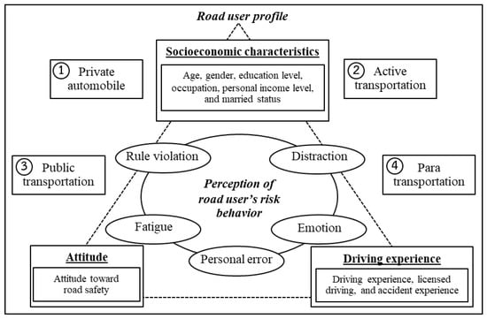 The main factors that cause road accidents include road users, vehicles, roadways, and environmental factors [27]. Road users engage in many risky behaviors while traveling on the road, varying from intentional to unintentional. Past studies have investigated many risky road behaviors and divided them into several categories (e.g., violations, aggressive driving, personal errors, and distractions.) [28]. Aggressive driving corresponds with deliberate behaviors that endanger and may increase the risk of a collision, such as honking at other road users and overtaking [29,30]. Violation behavior is the deliberate infringement of some regulated or socially accepted code of behavior, such as illegal crossing, not using a seatbelt or helmet, drunk driving, and running a red light [31,32]. In terms of personal errors, it represents the failure of planned actions to achieve their desired outcome without intervention, such as stopping suddenly and not switching on lights [31]. These are the concerns among several contributors to road traffic accidents. Finally, distractions shift or divert attention from driving, reducing concentration or focus when driving, such as listening to music, making phone calls, smoking, and eating [30,33]. Many studies have attempted to explain road users’ risk behaviors, from various perspectives. Economists use expected utility theory to explain and predict real-world risk behavior [34] in psychological models that relate to the theory of planned behavior or theories of reasoned action [35,36,37]. However, the study of risk behavior through different models has limitations, suggesting that risk studies involve many factors that vary across the context of the environment and society.