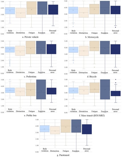 The score of the level of perception of risky behavior was determined based on six points, from zero to five. A zero score represents the perception that a situation will not cause any traffic accidents, while a score of five represents the perception that a situation causes serious accidents and may result in fatality and severe injury. Figure 3 demonstrates the different perceptions of risk behaviors and travel modes.
