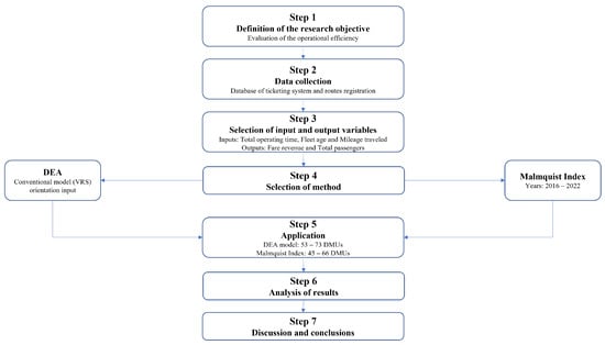 The first step corresponds to the definition of the research objective, which is to evaluate the operational efficiency of regular public transport routes. The second step involves the collection of data, considering factors such as importance, availability, and cost. Step 3 entails the selection of input and output variables for the model, as described in Section 2.3. In Step 4, the approach (DEA method and Malmquist index) is chosen. Step 5 involves applying the models to the case study, followed by steps 6 and 7, which include analyzing the results, discussing the findings, and drawing conclusions, respectively.