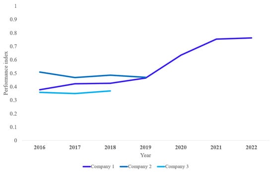 Figure 4 and Figure 5 present graphs related to the performance of Route 2, which was operated by three different companies. Both the performance index (Figure 4) and the Malmquist index (Figure 5) showed a decline, indicating a decrease in operational performance over time.