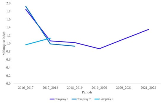 According to Oliveira et al. [], the index can be greater than, equal to, or less than 1, where greater than 1 indicates performance growth, while a value less than 1 reflects a reduction for periods t and .