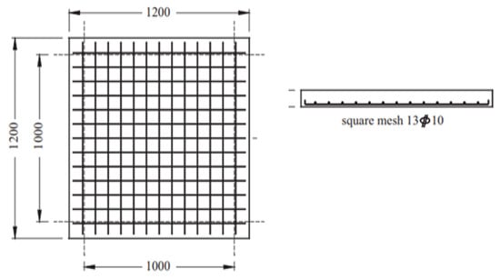 Several different variables are considered in this experiment, including steel plate thickness, plate size, number of bolts, and the SIMCON layer thickness. The slab specimen has a square plan with an overall side length of (1200 mm) and a thickness of (50 mm). The slabs have simple support on each of its four sides, over a span of (1000 mm), and in both directions. The reinforcement used in the slab specimen is a bottom mesh with (6 mm) diameter high tensile steel bars. One size of deformed steel bars was used as the main reinforcing bars with the size of (Ø6 mm nominal diameter) placed as flexural reinforcement in the tension face of NSC plates. All reinforcing bars were arranged and connected together using (1 mm) steel wire. The test results indicate that the average yield strength is equal to (560 MPa). The reinforcement used for the manufacturing of test specimens has yield strength, ultimate strength, and modulus of elasticity values of (fy = 426 Mpa), (fu = 595 Mpa), and (Es = 208 Gpa), respectively. The effective depth of flexural reinforcement in both directions is (18 mm). The rebar spacing in specimens is Ø6mm @75 × 75 mm (for NSC only). The specimen dimensions and reinforcing details are shown in Figure 2.