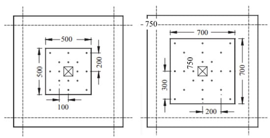 - Group 2 includes 12 samples that are strengthened using a steel plate with steel bolts, which are also subjected to either impact or cyclic loads. The steel plates are (500 mm × 500 mm), (750 mm × 750 mm), and (full scale = 1200 mm × 1200 mm) dimensions, having variable thicknesses (2 and 4 mm). These steel plates are externally bonded at the center of the slab tension face, presented in Figure 3, whereby (16, 24, 32) steel shear bolts of 6 mm in diameter and 60 mm length are welded to the steel plate in order of size (from smallest to greatest, respectively). Next, it is embedded into the concrete plate to enhance the composite action of the specimen.