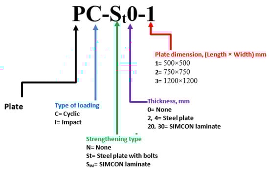 The plates in groups 2 and 3 are adopted to investigate the efficiency of the proposed strengthening techniques. The samples are named according to the type of loading and the way they are strengthened, as explained in Figure 4. Table 1 displays the test specimen parameters.