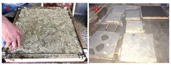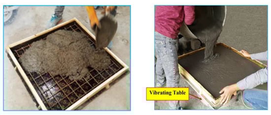 Before starting the casting process of the slab specimens, the mix volume determines the preparation and weighing of the selected materials. All testing slab specimens are cast in plywood molds and have dimensions of (1200 × 1200 mm) with a height of 50 mm, as presented in Figure 5. The casting procedure can be outlined through the following steps: