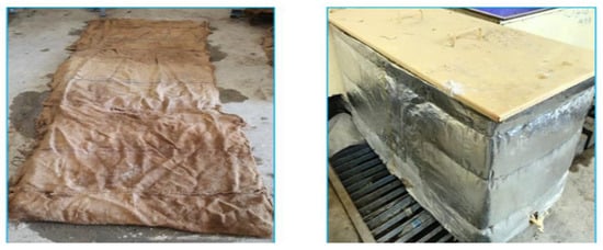 - Finally, burlaps are used to cure the plate specimens using saturated wet coverings. The samples are cured in water tanks at a temperature of (23 ± 2 °C), as presented in Figure 6.